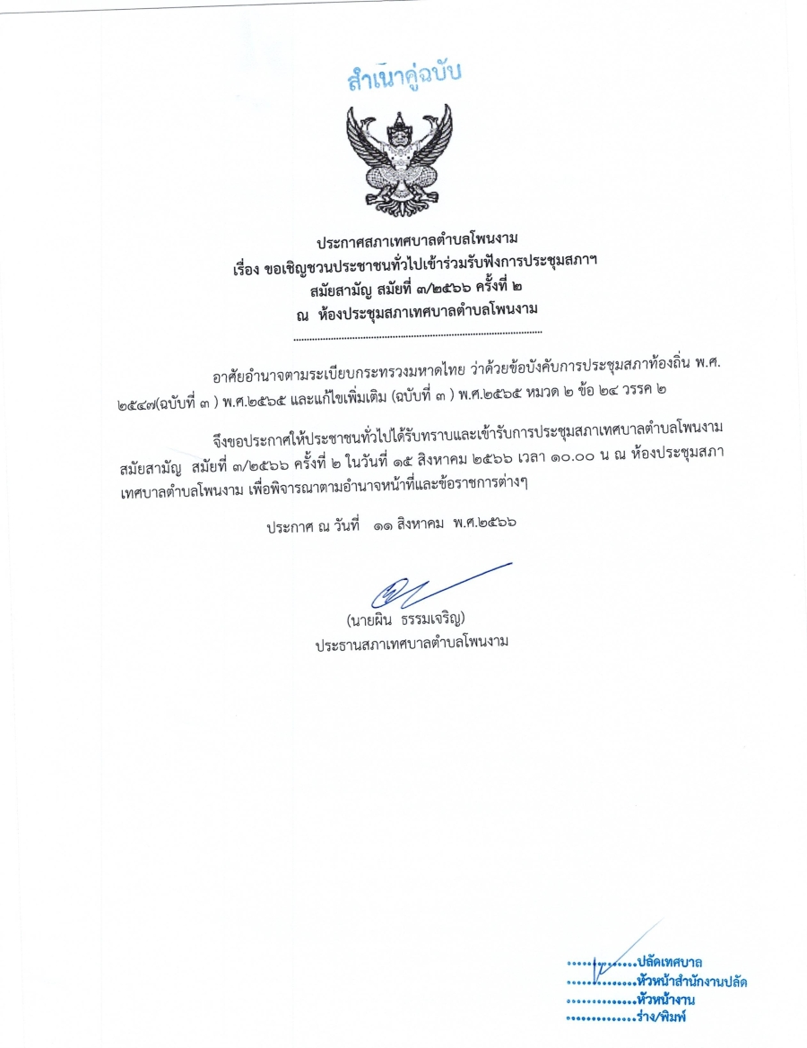 ประกาศสภาเทศบาลตำบลโพนงาม เรื่อง ขอเชิญชวนประชาชนทั่วไปเข้าร่วมรับฟังการประชุมสภาฯ สมัยสามัญ สมัยที่3/2566ครั้งที่2