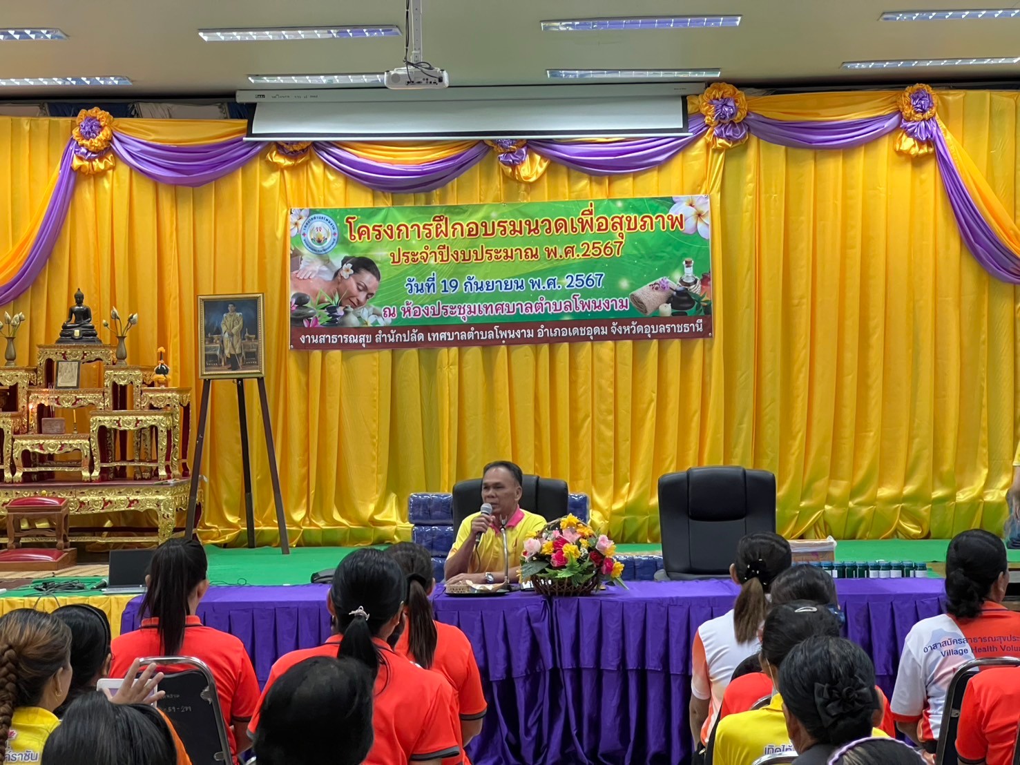 นายอุดร แก่นจันทร์ นายกเทศมนตรีตำบลโพนงาม เป็นประธานกล่าวเปิดโครงการฝึกอบรมนวดเพื่อสุขภาพ โดยมี คณะบริหาร,สมาชิกสภาเทศบาล,หัวหน้าส่วนราชการ,,ผู้นำชุมชน,พนักงานเทศบาล,ประชาชนตำบลโพนงาม เข้าร่วมโครงการ โดยมีวัตถุประสงค์หลักเพื่อให้ประชาชนรู้จักการนวดอย่างถูกวิธี เพื่อจะนำไปใช้ในชีวิตประจำวันได้ ณ หอประชุมเทศบาลตำบลโพนงาม
