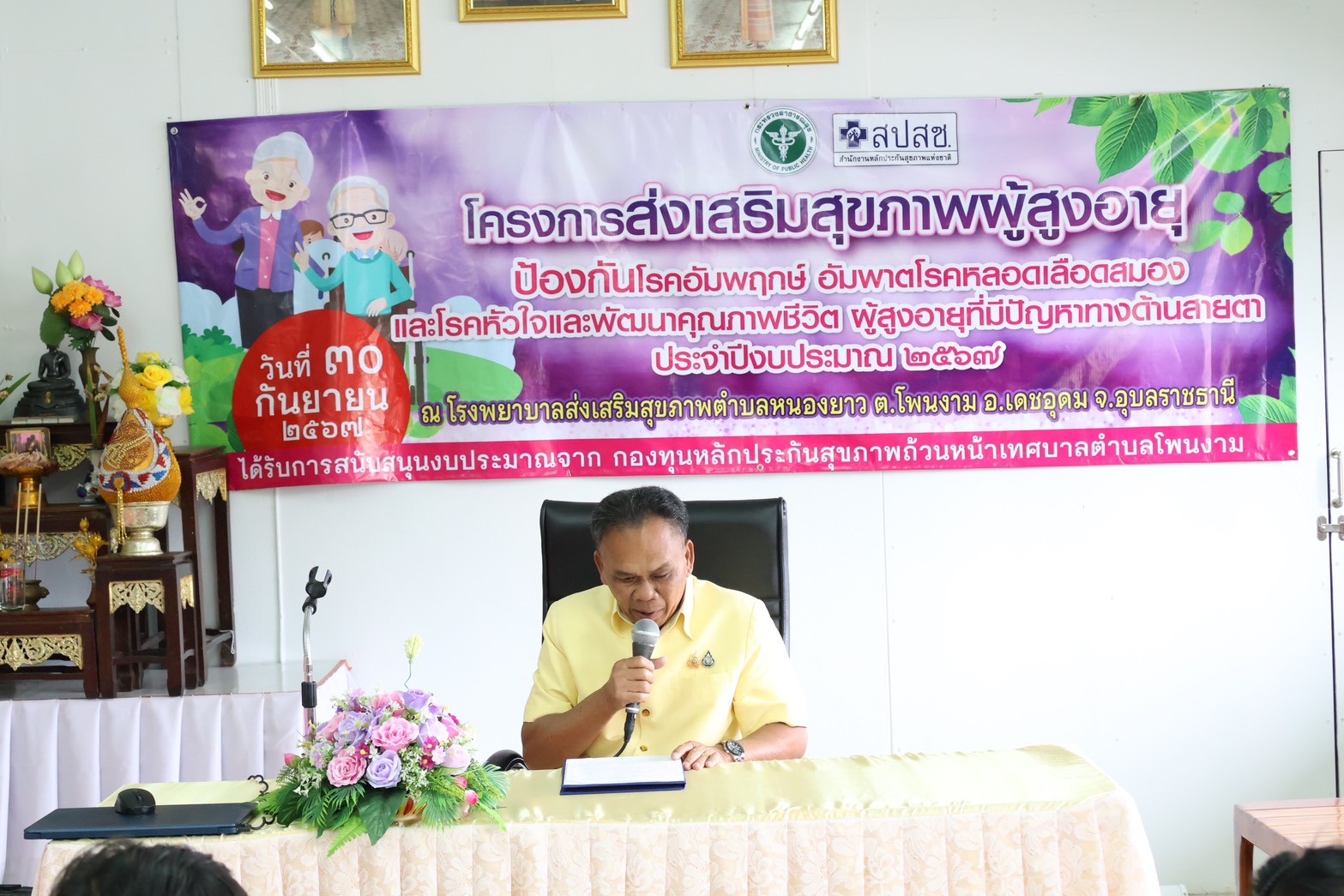 นายอุดร แก่นจันทร์ นายกเทศมนตรีตำบลโพนงาม ได้รับเกียรติเป็นประธานเปิดโครงการส่งเสริมสุขภาพผู้สูงอายุป้องกันโรคอัมพฤกษ์ อัมพาตโรคหลอดเลือดสมองและโรคหัวใจและพัฒนาคุณภาพชีวิต ผู้สูงอายุที่มีปัญหาทางด้านสายตา โดยมีนายศักดินนท์ ศรีแสง หัวหน้าฝ่ายอำนวยการ นายวิมล สีดาชาติ ผู้ช่วยเจ้าพนักงานพัฒนาชุมชน เข้าร่วมโครงการ ณ รพ.สต.หนองยาว