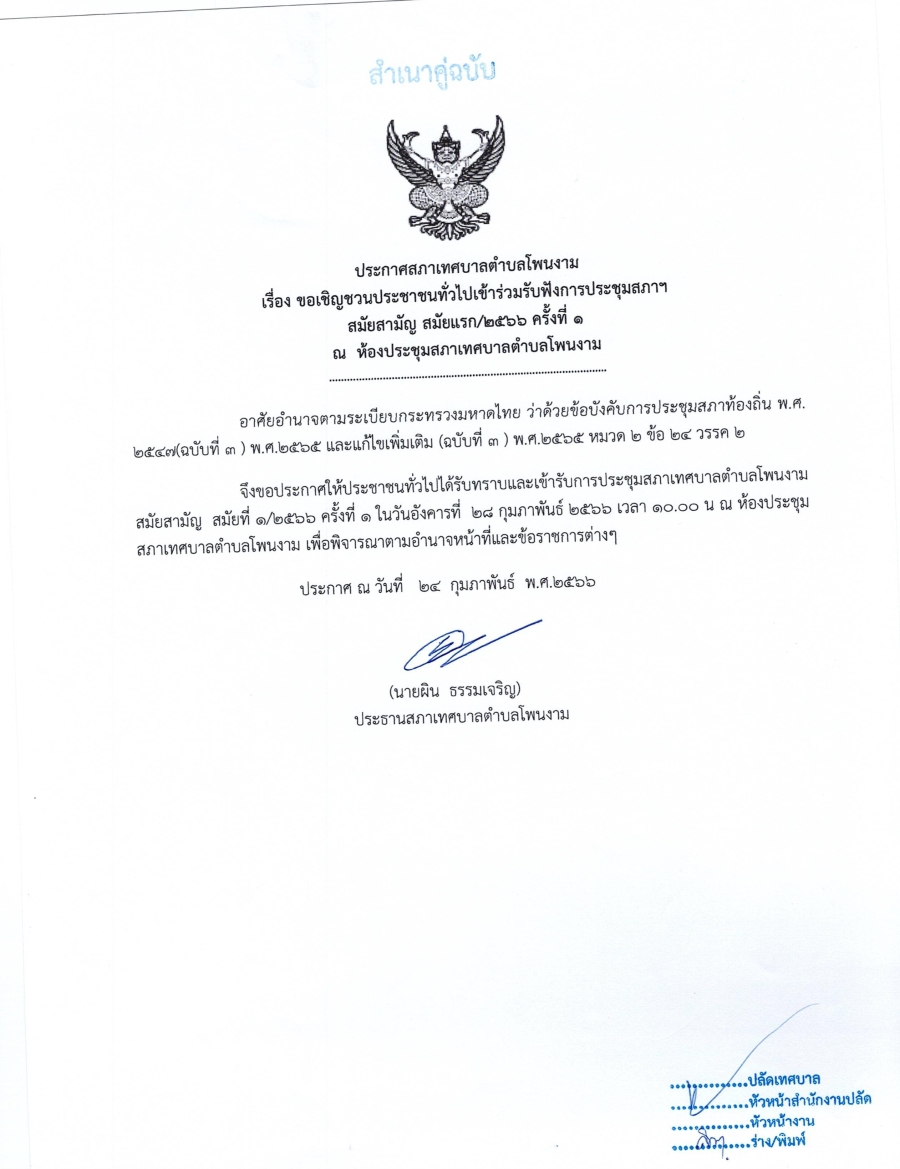 ประกาศสภาเทศบาลตำบลโพนงาม เรื่อง ขอเชิญชวนประชาชนทั่วไปเข้าร่วมรับฟังการประชุมสภาฯ สมัยสามัญ สมัยที่1/2566ครั้งที่1
